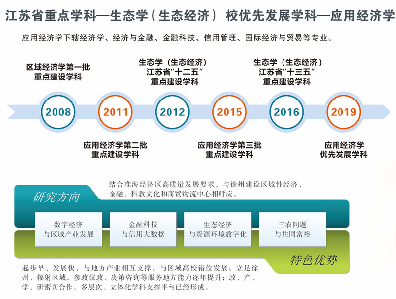 起步早、发展快,与地方产业相互支撑,与区域高校错位发展。本申请点拥有一批长期从事应用经济学(数字经济)研究与人才培养的师资队伍,自2008学校启动校级重点学科培育建设以来,应用经济学(数字经济)一直都是学校重点建设学科,并且每期考核都获得“优秀”等次。经过十多年的发展,本申请点已凝练遴选出数字经济与区域产业发展、金融科技与信用大数据、生态经济与资源环境数字化、三农问题与共同富裕四个学科研究方向,主要从事数字普惠金融、大数据金融与信用信息化、产业发展、生态经济、乡村振兴、数字产业、共同富裕等方面的研究。这些研究紧密结合淮海经济区高质量发展要求,与徐州建设区域性区域经济、金融服务、科教文化和商贸物流“四个中心”形成呼应,与在徐高校相关领域的研究互相补充,错位发展,具有一定的地域特色。